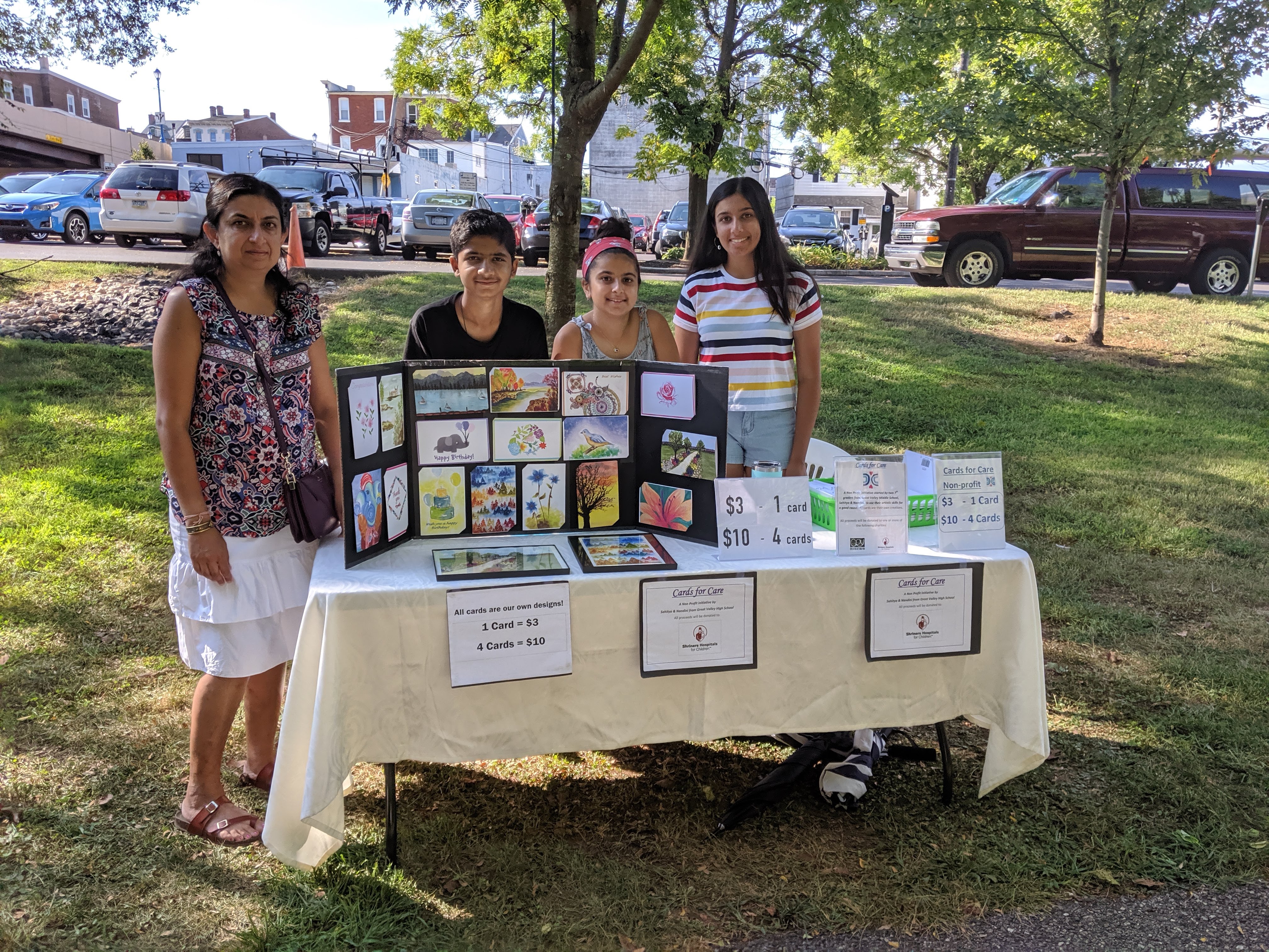 Selling cards handpainted by me for my non-profit Arts.Care at the local farmer's market.